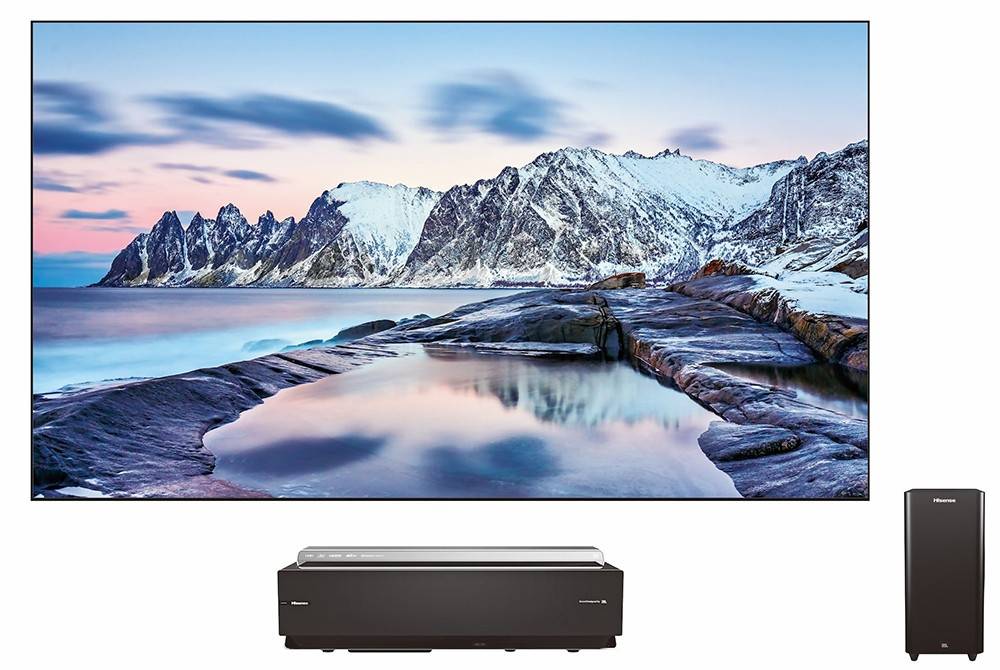 Флагманский телевизор компании Hisense диагональю 100 дюймов имеет разрешение 4K UHD и относится к категории лазерных экранов. Сам телевизор правильнее называть системой, так как в комплекте имеется лазерный проектор, с помощью которого и подается изображение. Яркость проектора составляет 3000 кд/м² (такие показатели достигаются благодаря наличию микросхемы Texas Instruments DLP 4K UHD DMD).