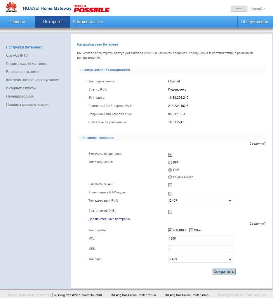 Настройка роутера Huawei WS319 в режиме динамического IP не имеет существенных изменений, поэтому стоит отметить лишь несколько основных отличий: тип соединений не (PPP), а (IP); для адресации IPv4 нужно выбрать DCHP; в пункте NAT вписываем значение NAPT.