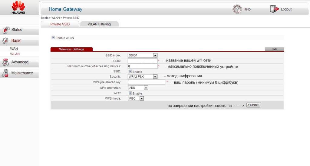 Чтобы на телефоне без проблем можно было пользоваться Wi-Fi Huawei сетью, необходимо зайти во вкладку домашней сети и там выбрать пункт настроек Wi-Fi. В строке SSID впишите любое название на ваше усмотрение, так будет называться ваша сеть после всех действий. Далее обязательно активировать сеть, поставив галочку напротив соответственной функции. Касательно режимов безопасности можно выбрать какой угодно, в зависимости местонахождения роутера. Пароль лучше выбрать подлиннее, с большими и маленькими буквами, обязательно добавив несколько цифр. Это всё, что нужно, после данных действий вай-фай должен запуститься. Если возникли какие-то проблемы, воспользуйтесь скриншотом: