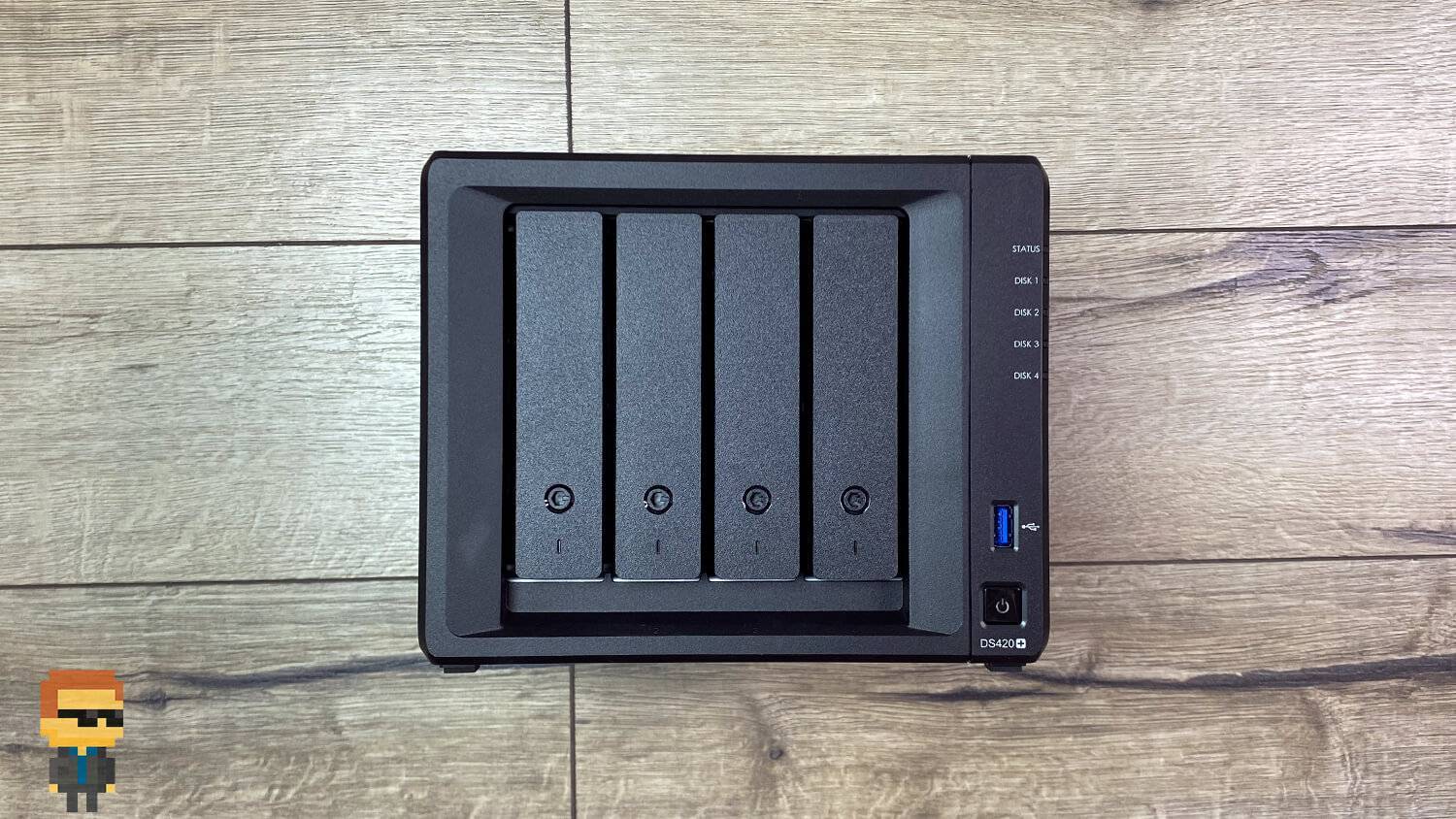Сверху и по бокам нет ни элементов управления, ни разъемов, ни декоративных вставок. Только перфорированные логотипы Synology, которые функциональны, поскольку являются воздухозаборными отверстиями.