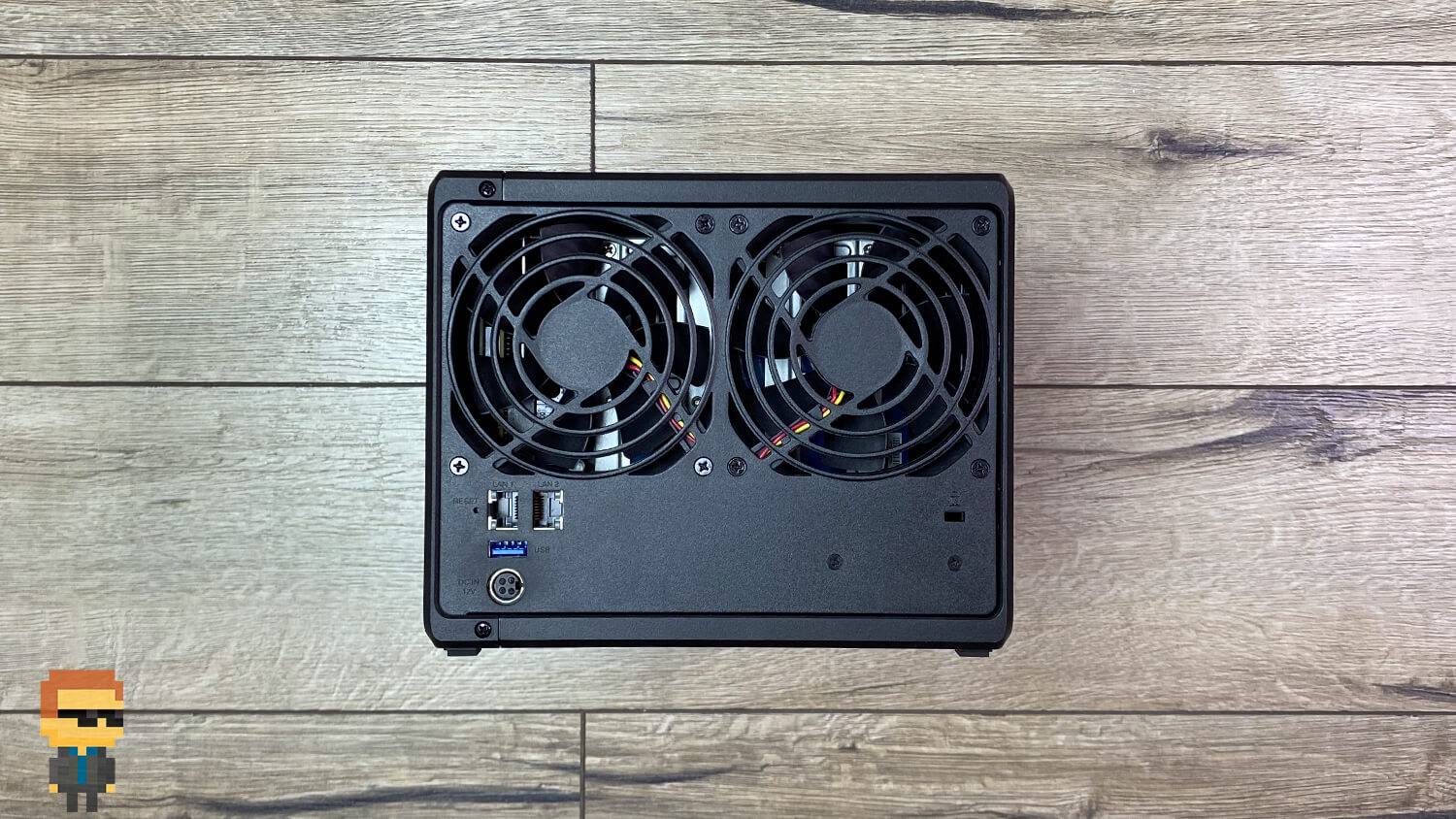На задней панели расположены отверстия для двух 92-миллиметровых вентиляторов, которые необходимы для охлаждения файлового сервера. Справа увидел замок Kensington. Ниже слева видны два гигабитных порта LAN и один разъем USB 3. Встроенного блока питания у DS420+ нет, поэтому используется внешний.