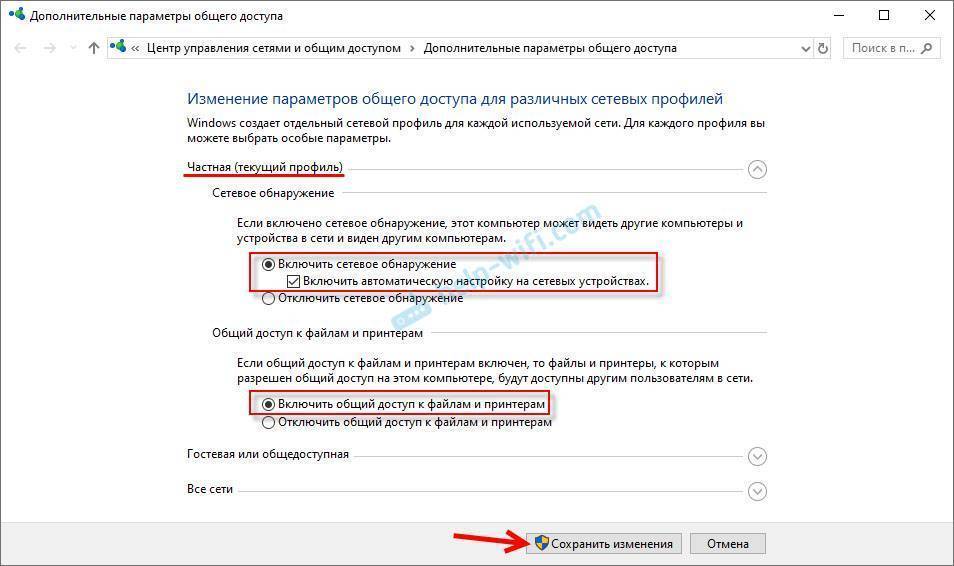 Далее нужно поочередно раскрыть три вкладки «Частная», «Гостевая», «Все сети» и включить общий доступ к файлам и принтерам, сетевое обнаружение, отключить парольную защиту.