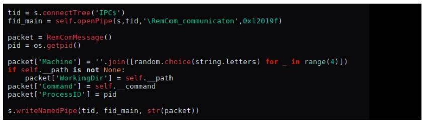 Копирование и запуск исполняемого файла происходят следующим образом. Сперва происходит подключение к ресурсу ADMIN$ (C:\Windows), куда помещается файл. Затем необходимо подключиться к ресурсу IPC$ и обратиться с его помощью к интерфейсу SCM для создания и старта сервиса, который запустит скопированный файл. Все это происходит поверх протокола SMB.