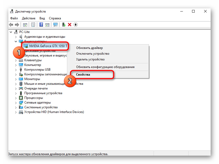 Аналогичным образом можно выполнить откат одного драйвера, а не всей системы. Следующий метод так же актуален, если после установки драйвера nVidia у вас не появился черный экран, а всего лишь упала производительность видео. Откройте диспетчер устройств, после чего выберите видеокарту в списке, кликните по ней правой кнопкой мыши и выберите «свойства».