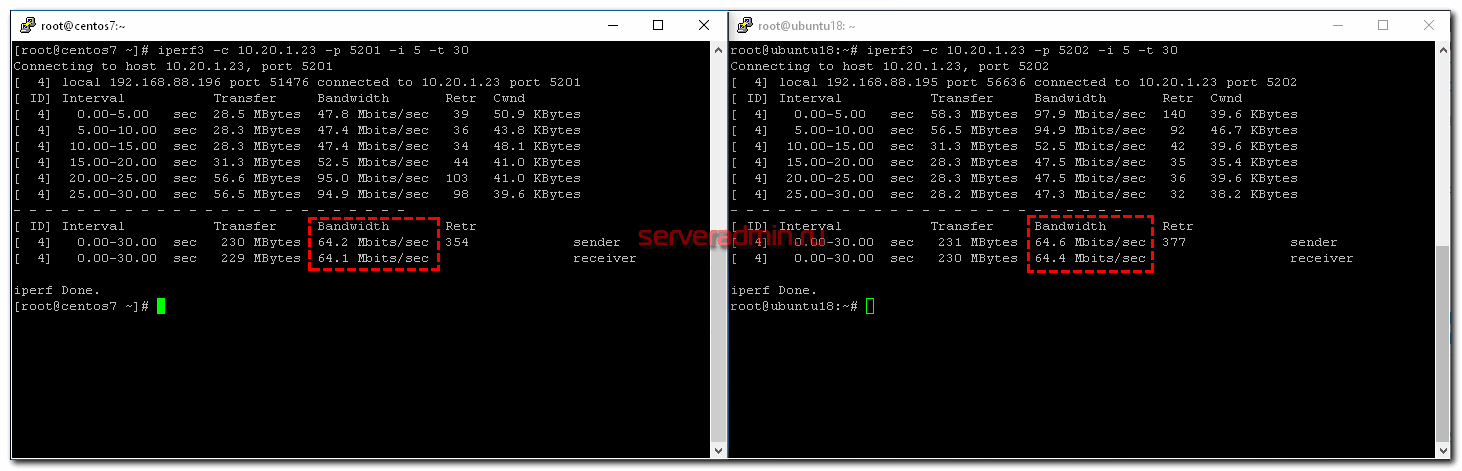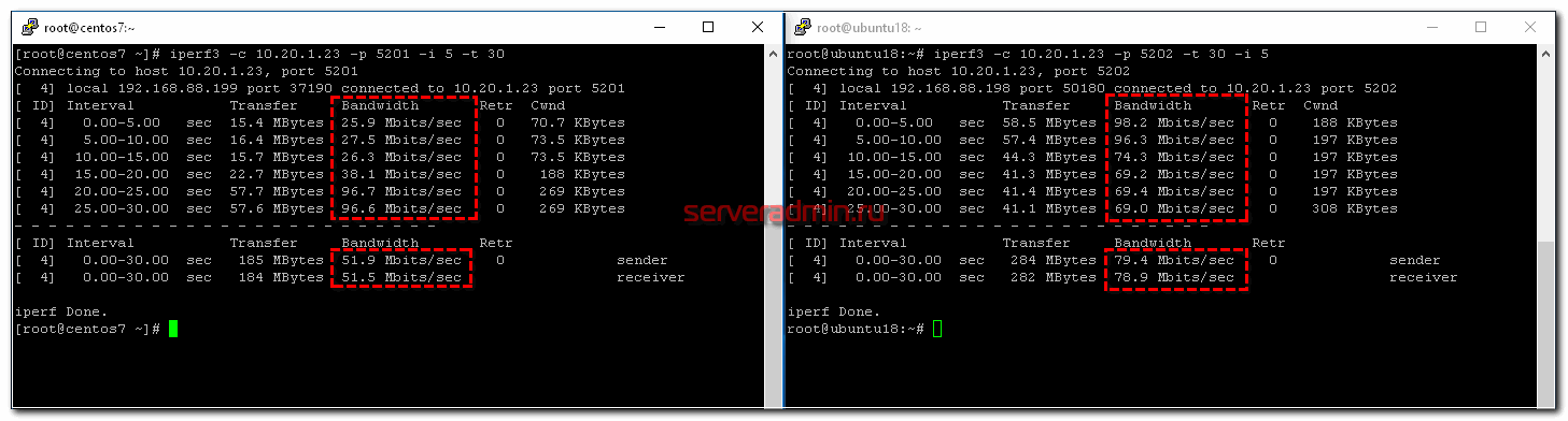 Я сначала запустил проверку скорости на ubuntu18, а через 10 секунд на centos7. Видно, что ubuntu сначала качала на полной скорости 100 Мбит/c, а потом, при запуске параллельного теста на centos, снизила скорость на треть. По факту получилось, что кто раньше запустил тест, тот и забрал себе больше канала. Средняя скорость загрузки разных клиентов отличается – 51.9 Mbits/sec у того, кто начал позже, против 79.4 Mbits/sec. Если бы тут работал какой-нибудь торрент клиент, он бы забрал большую часть канала себе.
