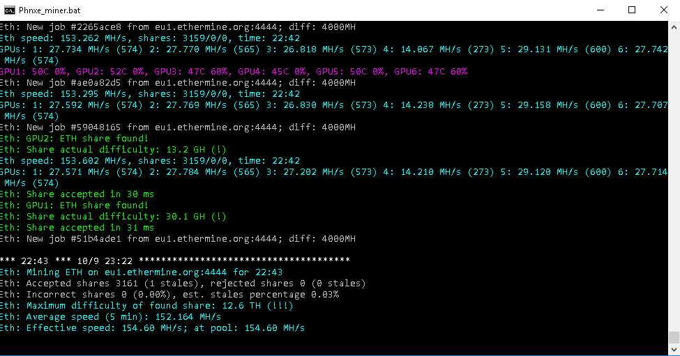 Окно программы Phoenix Miner, в котором видно, что шары были приняты сервером eu1 пула ethermine за 30 и 31миллисекунду: