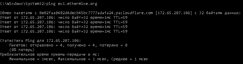При этом пинг до сервера eu1 пула ethermine составляет всего 1 мс: