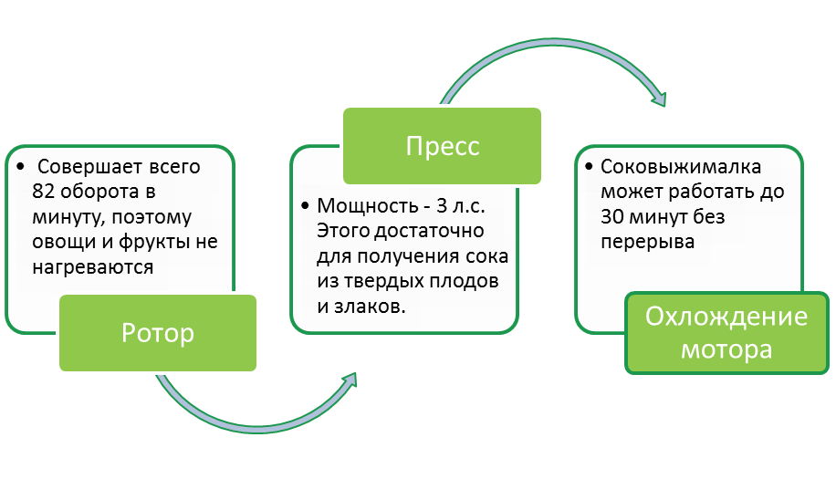Технология отжима сока : скорость вращения валиков всего лишь 110 оборотов в минуту, поэтому полезные молекулы не разрушаются, как в соковыжималках с центрифужным принципом отжима, и не происходит окисление с воздухом.