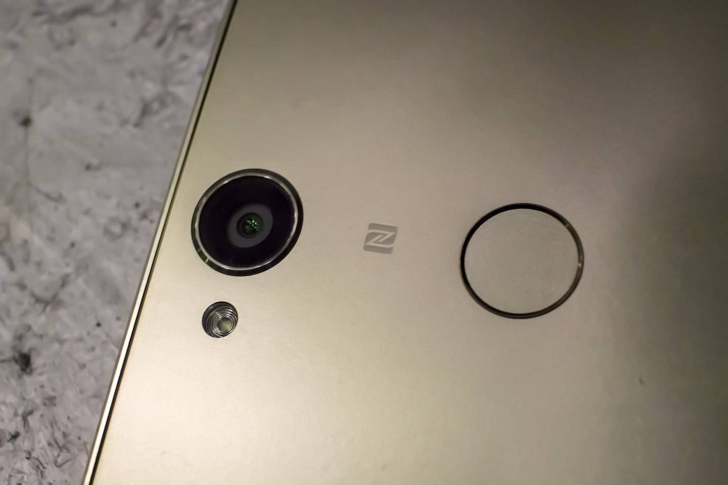 В центре верхней части задней панели, украшенной логотипом Sony, поместили объектив основной камеры с чуть выступающей защитной окантовкой. Чуть левее него нашлось место для светодиодной вспышки, а ниже – для круглой емкостной площадки дактилоскопического сканера. Область антенны NFC отмечена соответствующим значком.