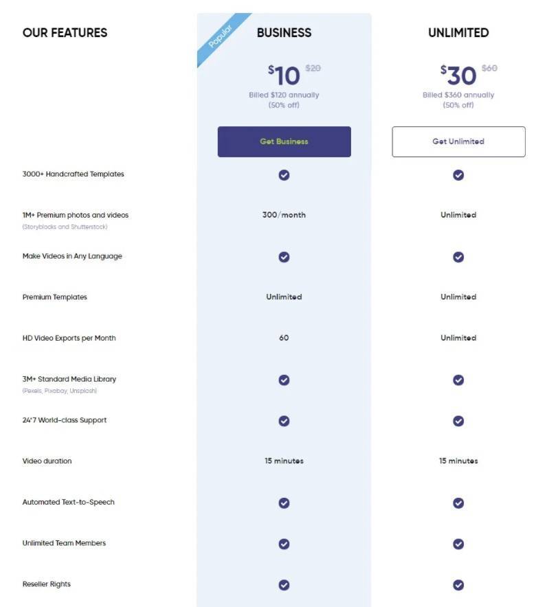 А помимо очевидного, платная подписка даёт доступ к автоматической озвучке текста, правам реселлера, безграничному количеству участников команды и 60 HD-видео в месяц. Длительность видео, правда, ограничена 15 минутами и в случае Business-плана, и под Unlimited-вариантом. Но это вдвойне должно намекнуть вам целевую аудиторию и приоритетные задачи для этого сервиса.