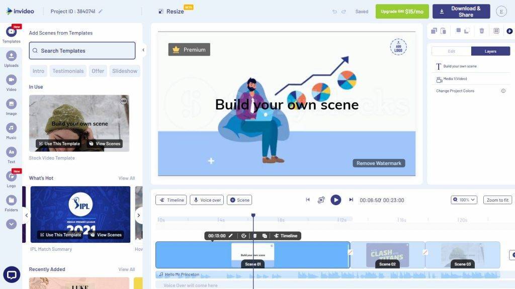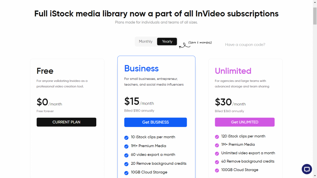 Кроме бесплатной версии в платформе InVideo предусмотрено два платных пакета с более широким функционалом. Пользователь получает доступ к бесплатной библиотеке файлов iStock и озвучке текста Искусственным интеллектом на всех языках.