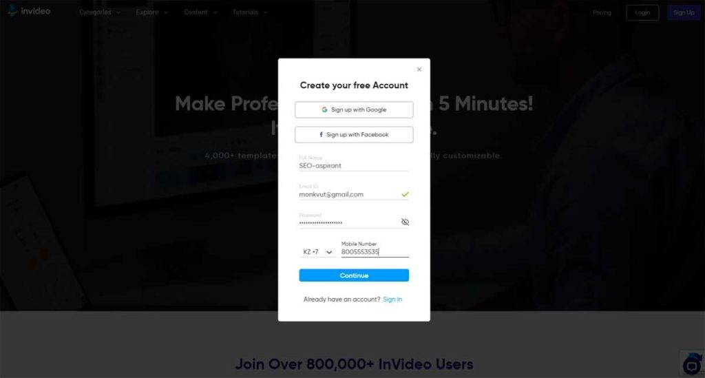 Завести аккаунт в InVideo проще простого. Форма регистрации здесь короткая и понятная. Более того, авторизацию можно проходить через свою учётную запись в Facebook или Google.