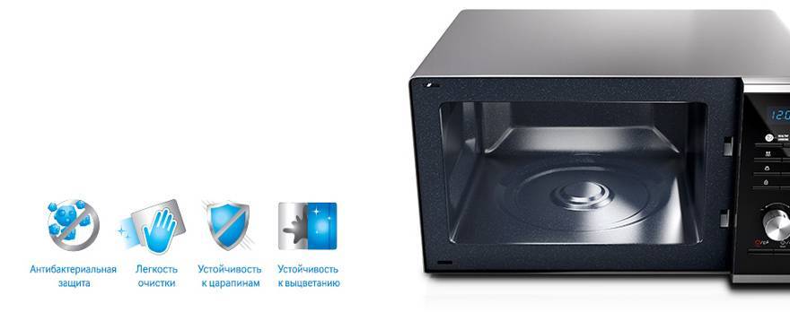 Немаловажно подобрать самое стойкое покрытие камеры: выбирайте керамику или БИО-керамику, такое напыление неприхотливо в уходе. Восстанавливать поцарапанные внутренние стенки хлопотно и дорого — об этом подробнее вы узнаете на странице «Чем покрасить микроволновку внутри, если покрытие облезло »