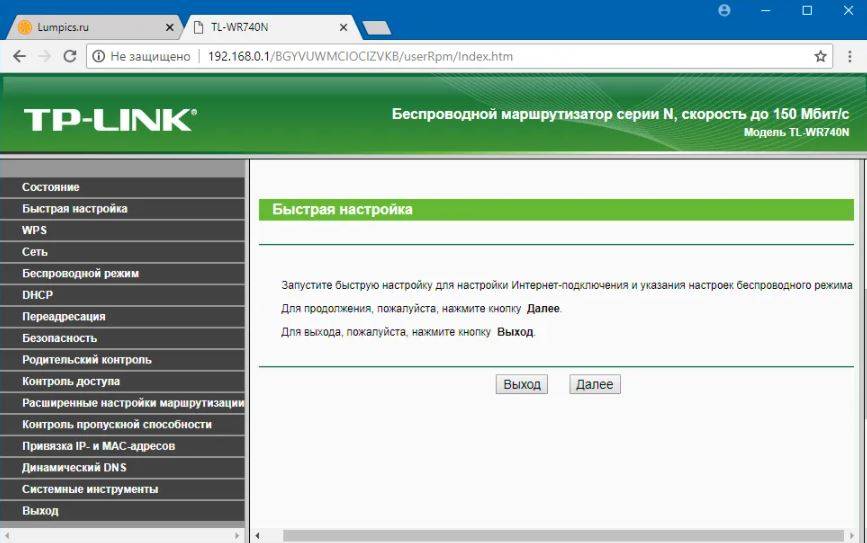 - Перейти в веб-интерфейс устройства. Для этого в адресной строке браузера надо ввести IP 192.168.0.1.
