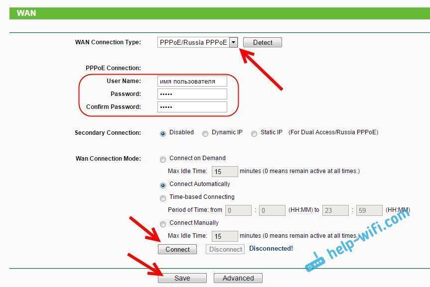 Если у вас Динамический IP, то можете сразу сохранить настройки, и интернет через маршрутизатор должен заработать. А если PPPoE, и т. д., то нужно задать необходимые параметры. Как правило, это имя пользователя и пароль. Может быть еще IP адрес. И сохраните настройки нажав на кнопку Save (Сохранить) .