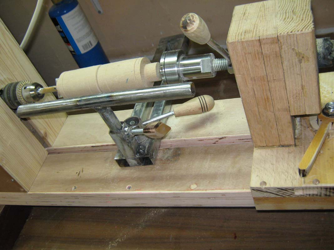 Деревянная заготовка детали задней бабки по форме должна совпадать с контуром передней. А для закрепления середины используют стальная заготовка с втулкой, у которой нарезана внутренняя резьба М 14 х 1,5. Еще необходимо не забыть об установке стопорного болта М 8. По краям втулки необходимо нарезать резьбу М 24 х 3 для завинчивания гайки, удерживающей втулку.
