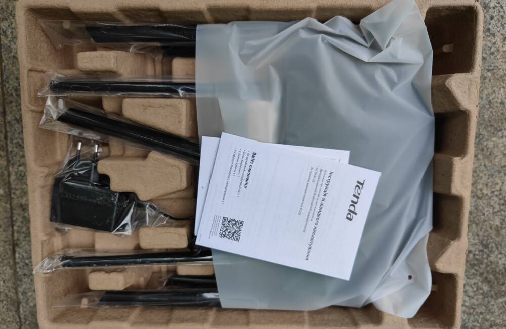 Краткое справочное пособие содержит QR-код, который позволяет загружать мобильное приложение Tenda Wi-Fi для Android и iOS. Обычная, стандартная комплектация, особенно учитывая цену сетевого устройства.