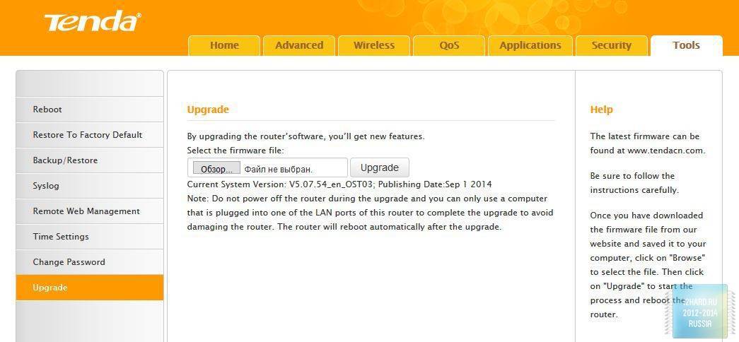 Есть возможность обновления прошивки, для этого нужно скачать файл прошивки на компьютер. На момент тестирования у роутера стояла версия прошивки от 1 сентября 2014 г.