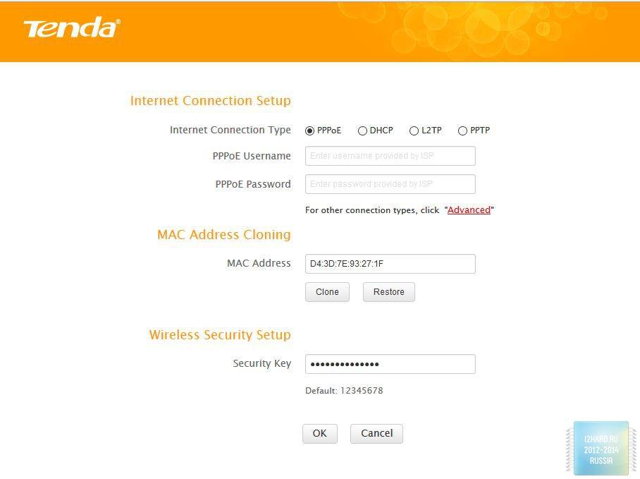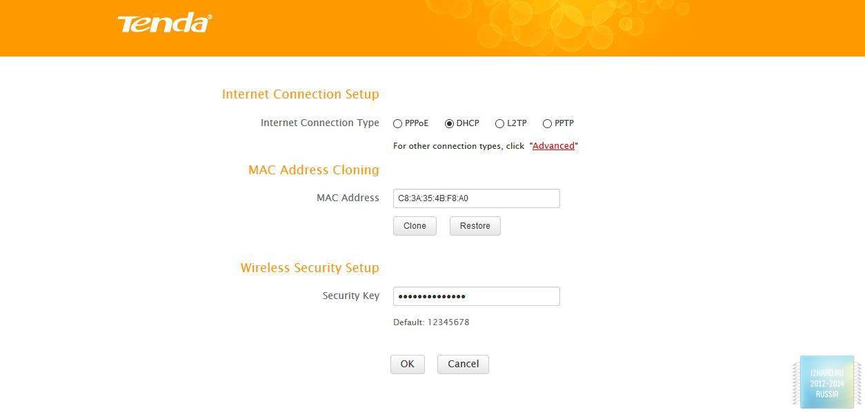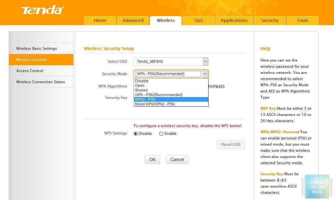 Жмем «уточнение» и переходим к безопасности беспроводной сети, также само в верхнем меню. Настраиваем режим безопасности, выбираем там WPA2-PSK. Ключ, он же пароль на роутере Tenda, нужно лучше придумать сложнее, чем от 1 до 9.
