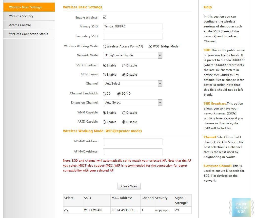 В Tenda настройка роутера заканчивается этапом отладки беспроводной сети. В верхнем меню выбираем установку беспроводной сети. Затем кликаем на основные установки сети роутера тенда. Действуем так, как указано на скриншоте. SSID – это имя беспроводной сети, здесь можно включить фантазию. Все остальное прописываем как на картинке.