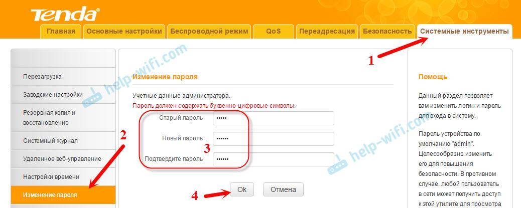Пароль на роутере Tenda по умолчанию admin, такой же, как и логин. После мы рекомендуем сменить пароль от меню управления для Вашей же безопасности. Это можно сделать в инструменте системы.