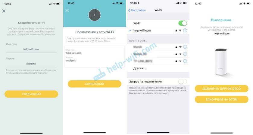 Следующий шаг – настройка Wi-Fi сети. Нужно придумать имя сети и пароль, указать их в соответствующих полях и продолжить настройку. Когда появится сообщение: “Для продолжения настройки подключите смартфон/планшет к Wi-Fi сети Deco”, то зайдите в настройки Wi-Fi на своем устройстве и выполните подключение к сети, которую только что создали. Используя установленный пароль.