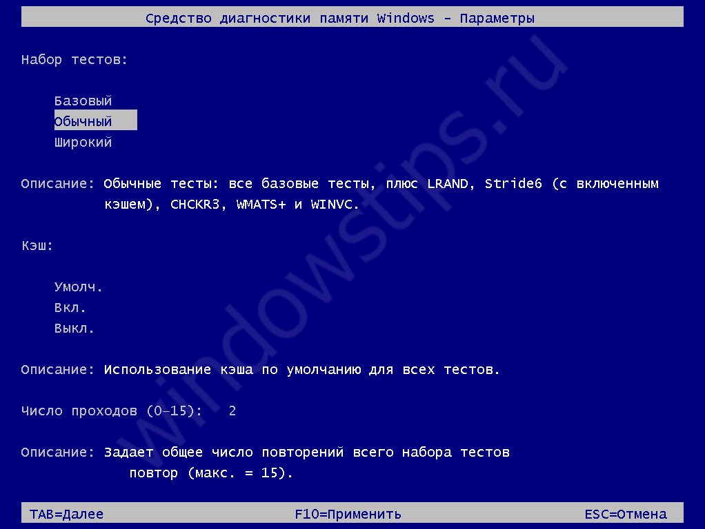 - Для возвращения в окно утилиты Windows Memory Diagnostics Tool, не изменяя настройки по умолчанию, нажмите на клавишу «Tab».