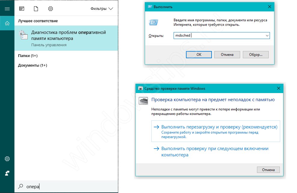 В Windows 10 есть встроенное средство тестирования «оперативки», которое можно использовать в случае отсутствии альтернатив. Что бы его запустить, введите в поиске «Диагностика проблем оперативной памяти компьютера» или в окне Выполнить (Win+R) команду mdsched.