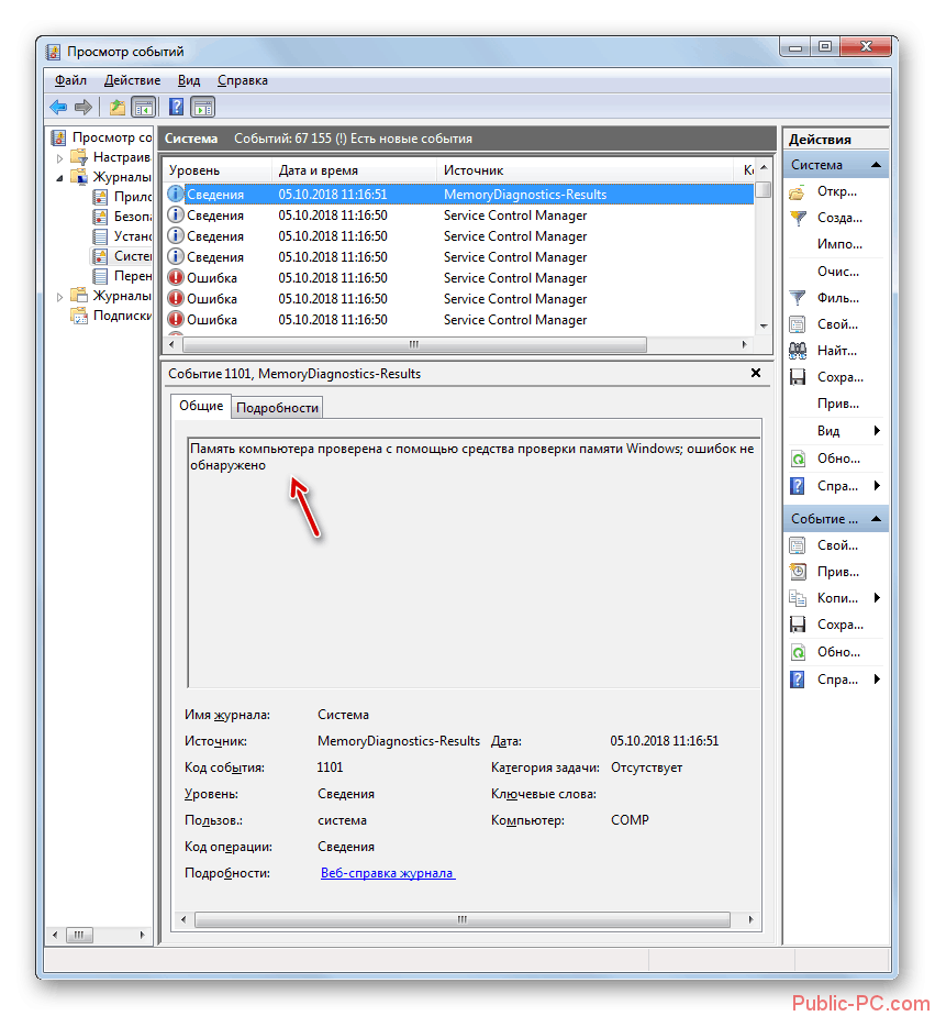 В области «Система» кликните по «MemoryDiagnostics-Results». Ниже отобразится информация о событии. Эту информацию можно получить из области «Действия», в правом нижнем углу окна «Просмотр событий».