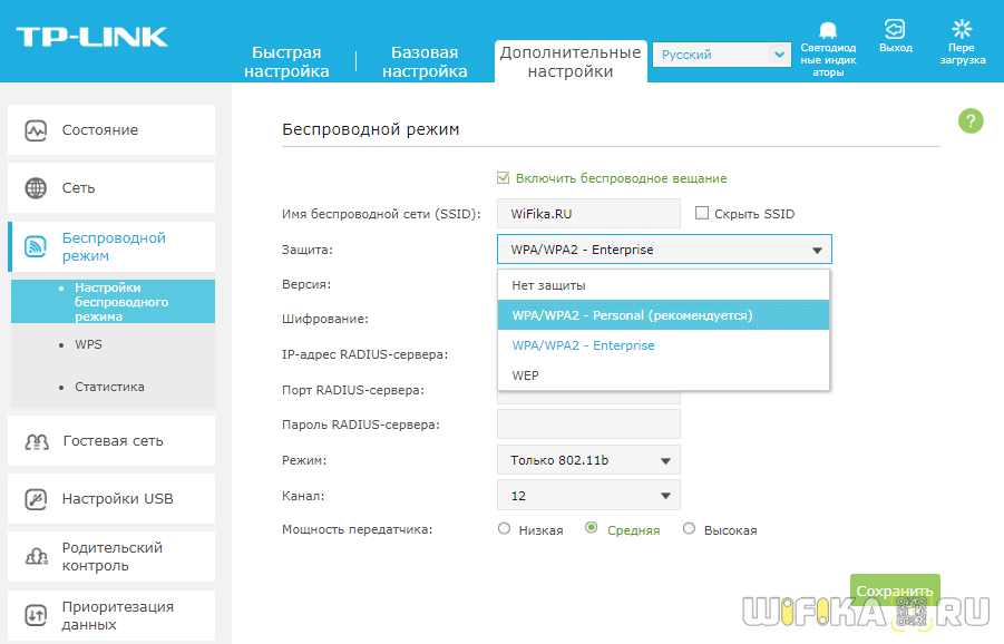 - Enterprise — более сложная конфигурация, которая требует включенной функции RADIUS на роутере. Работает она по принципу DHCP сервера, то есть для каждого отдельного подключаемого гаджета назначается отдельный пароль.