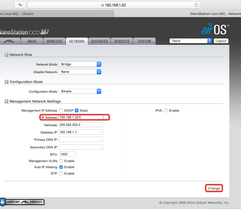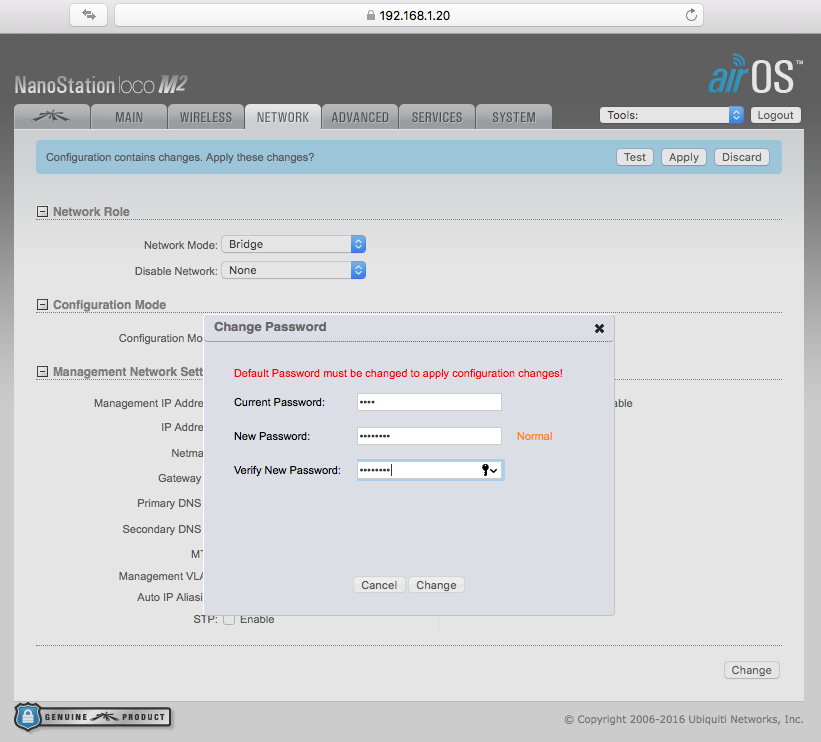 При первом изменение настроек устройство попросит сменить пароль, вводим текущий ubnt и 2 раза свой новый пароль. Нажимаем Change, после чего устройство перезагрузиться и будем доступно по новому адресу 192.168.1.200
