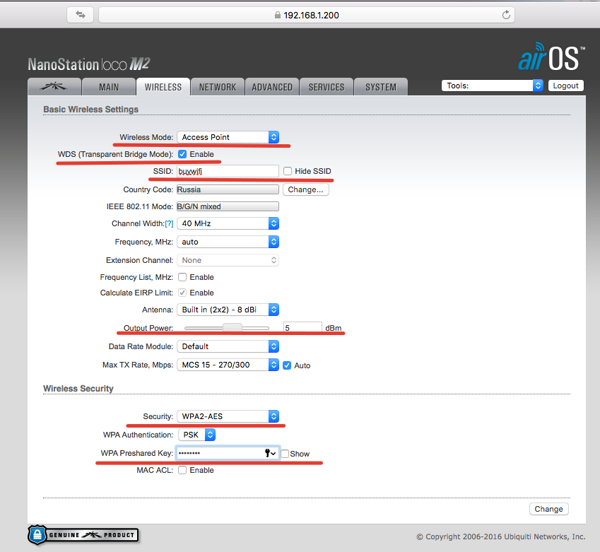 Изменять настройки NanoStation должен только администратор. Чтобы никто другой не смог получить доступ к настройкам, нужно изменить пароль доступа.