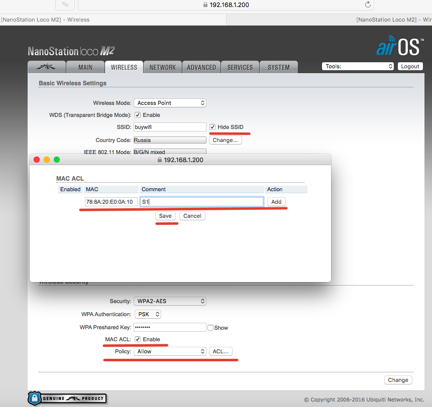 Далее внизу ставим галочку MAC ACL, параметр Policy — Allow и нажимаем ACL.