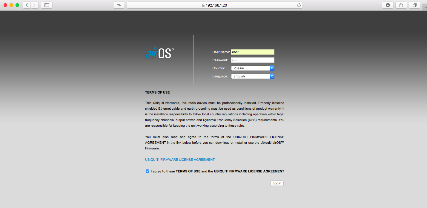 Вводим логин и пароль по умолчанию ubnt, выбираем страну и язык, ставим галочку и нажимаем Login. Попадаем на главную страницу.