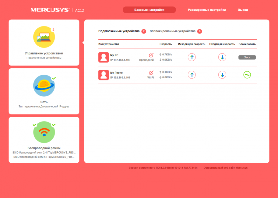 Из первой вкладки можно управлять подключенными устройствами — переименовать их, изменять исходящую и входящую скорости или заблокировать определенное клиентское устройство. Во второй вкладке меняется/настраивается тип подключения, а в третьей находится управление беспроводным подключением.