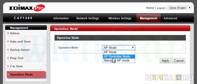 Из множества настроек интереснее всего посмотреть на фирменное ПО Edimax, которое позволяет объединить несколько точек в одну целостную систему. Для ее активации необходимо одну из точек сделать управляющей, а остальные подчиненными. Эта настройка находится в разделе «Management», пункт меню «Operation mode». Для головного устройства выбираем режим «AP Controller Mode», а для остальных — «Managed AP Mode»