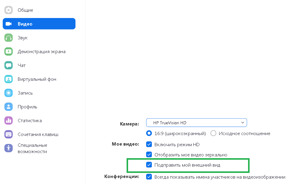 В Zoom доступна функция ретуши лица — фильтр слегка сглаживает неровности, размывает тон кожи и увеличивает контрастность. Зайдите в настройки, нажав на значок шестеренки в правом верхнем углу. В разделе Видео установите галочку рядом Подправить мой внешний вид.