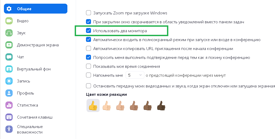 Если у вас дома несколько мониторов, их оба можно подключить в настройках Zoom. Зайдите в настройки, раздел Общие, поставьте галочку рядом с Использовать два монитора. После подключения двух мониторов во время видеовстречи участники будут на одном, все остальное на другом.