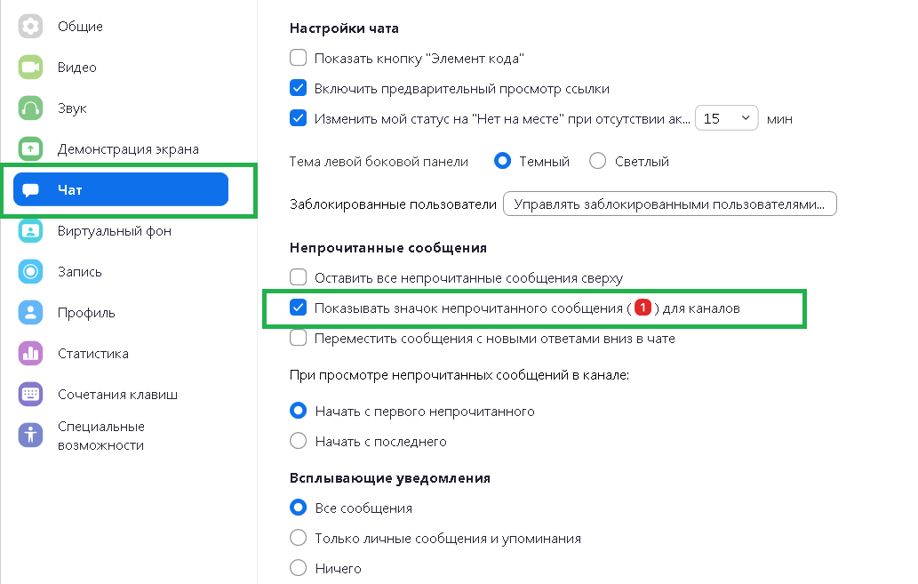 Как в Slack и Microsoft Teams, в Zoom есть возможность создать канал, в котором можно обсуждать с коллегами рабочие вопросы. По умолчанию Zoom не показывает количество непрочитанных сообщений на канале. Чтобы включить счетчик, перейдите в настройки -> Чат. Активируйте функцию Показывать значок непрочитанного сообщения для каналов.