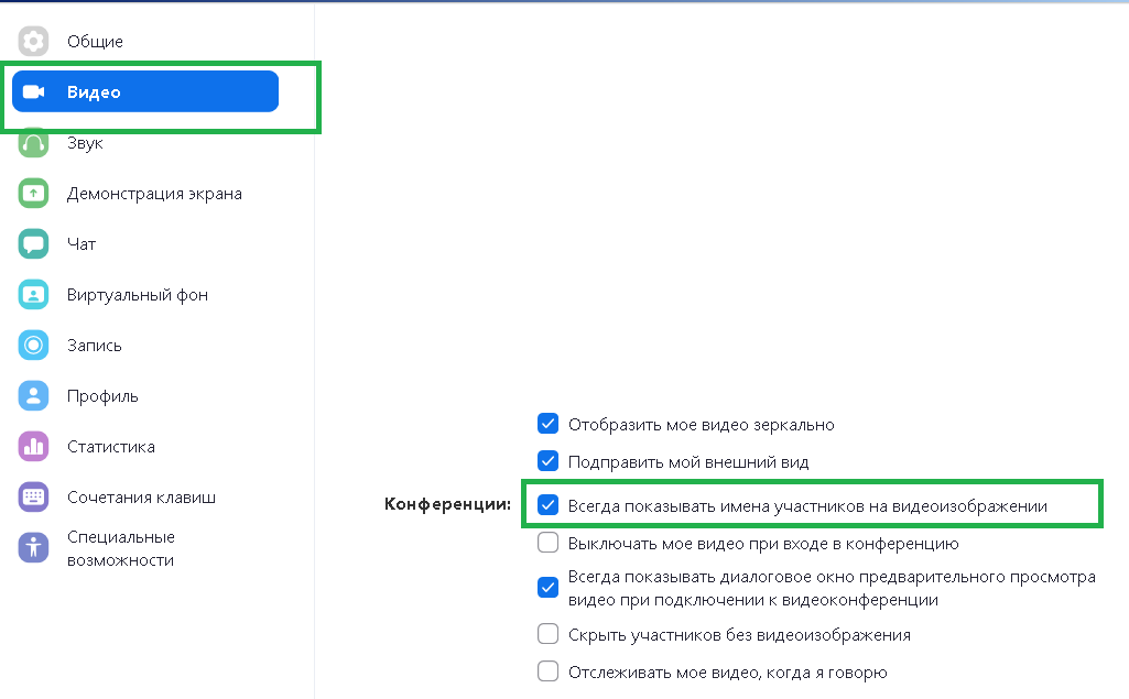 По умолчанию Zoom показывает имена всех участников видеозвонка. Но не все пользователи используют реальные имена. Если во время видеоконференции вам понадобится обратится к участникам, можно включить функцию отображения реальных имен пользователей. Сделать это можно опять же в настройках, раздел Видео.