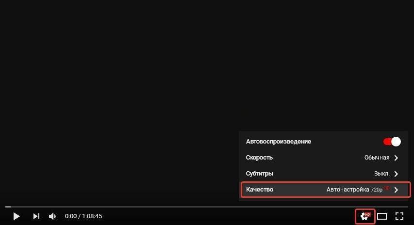 Шаг 2. Нажать на значок настроек (в виде шестеренки) в интерфейсе видеоплеера и щелкнуть по графе «Качество».