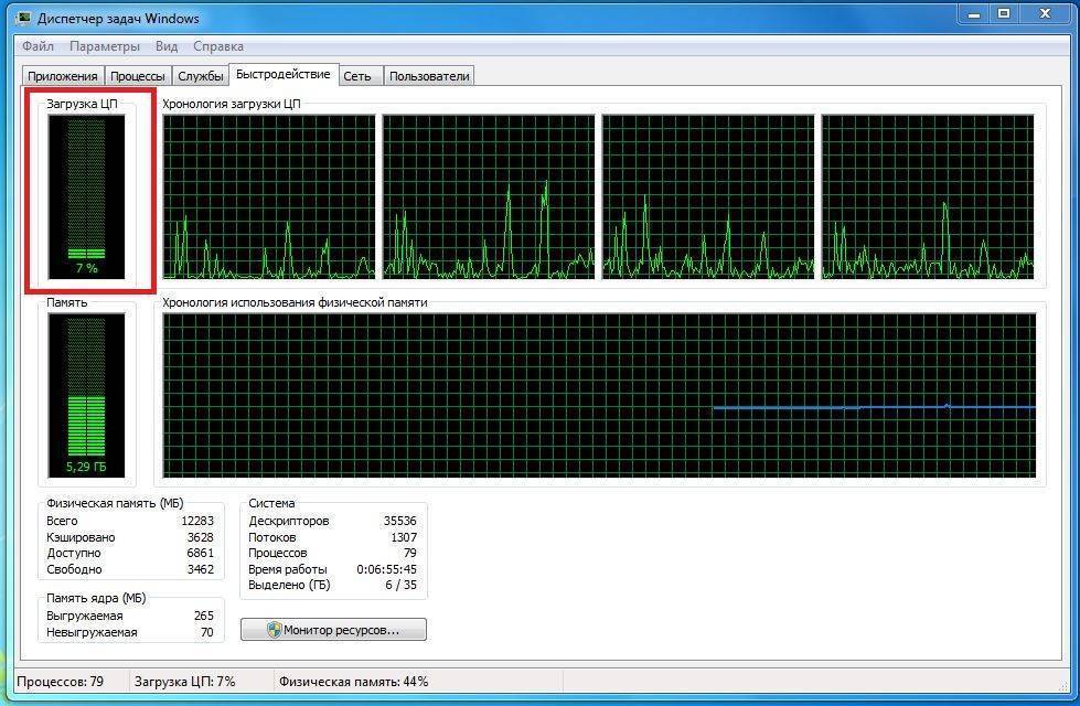 Шаг 3. Перейти на закладку «Производительность» и посмотреть загрузку элементов «ЦП» ( центральный процессор) и «Память».