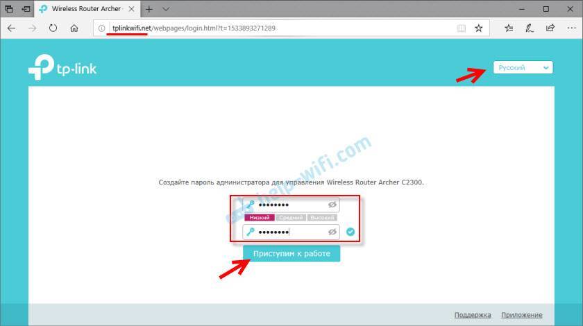 На подключенном к роутеру устройстве, в браузере нужно перейти по адресу tplinkwifi.net, или 192.168.0.1. Более подробно об этом я рассказывал в этой статье. В случае с Archer C2300, он сразу попросит нас установить пароль администратора роутера. Этот пароль нужно куда-то записать и/или запомнить. Его нужно будет вводить каждый раз, когда вам понадобится доступ к настройкам роутера.