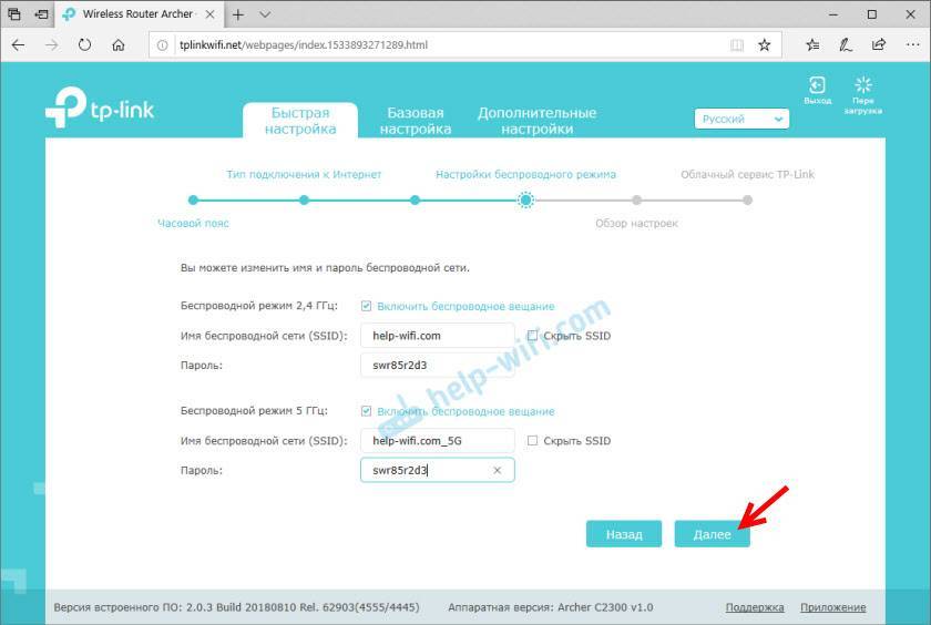 После настройки подключения к интернету, TP-Link Archer C2300 предложит нам настроить Wi-Fi сеть. Какие-то особые настройки там менять не нужно. Достаточно только изменить имя беспроводной сети (SSID). При желании можно оставить заводское имя (которое указано по умолчанию). А вот пароль рекомендую сменить