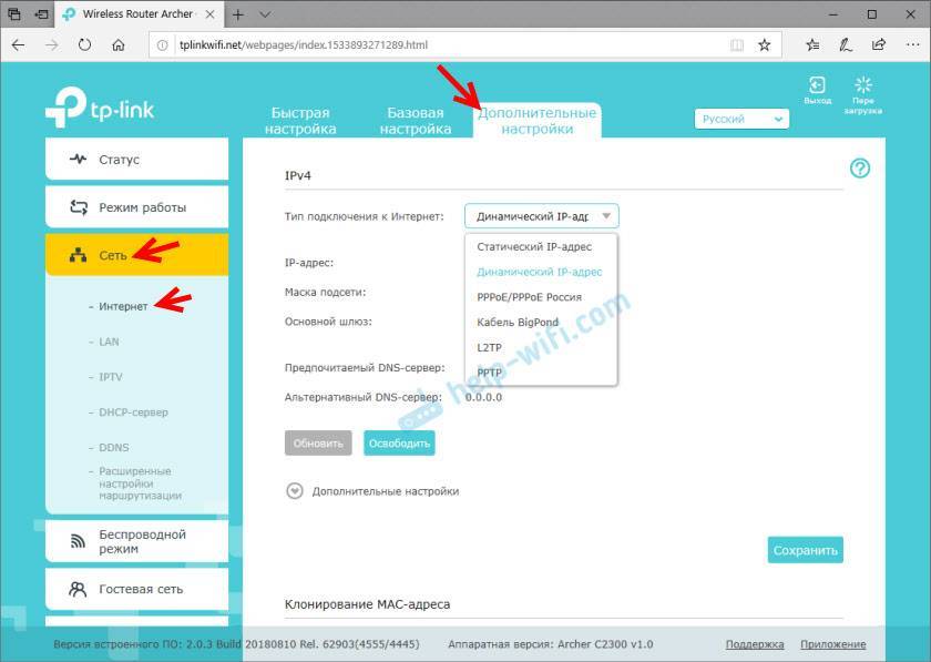 Дальше, в зависимости от выбранного провайдера и типа подключения, понадобится указать имя пользователя, пароль, адрес сервера. Это для PPPoE, L2TP, PPTP. Если у вас “Динамический IP”, то ничего дополнительно настраивать не нужно. Разве что клонировать MAC-адрес, если ваш провайдер делает привязку по MAC-адресу.