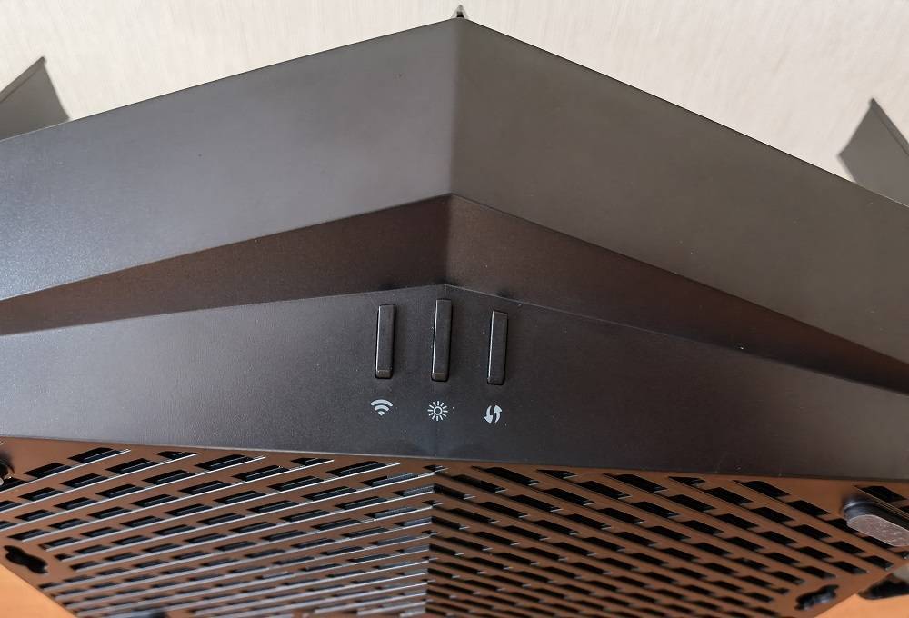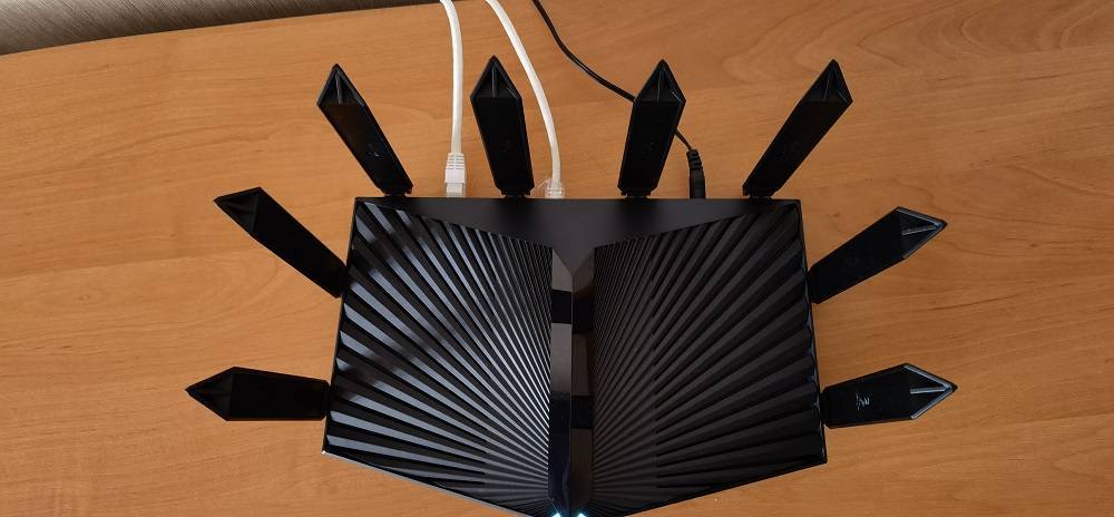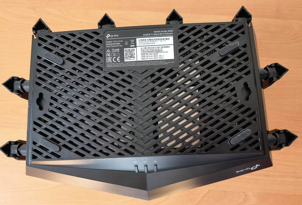 Маршрутизатор выглядит оригинально благодаря необычной форме и необычному рисунку в верхней части, который напоминает лопасти вентилятора. В сочетании с массивными треугольными антеннами, которых аж восемь, все выглядит несколько футуристично и будет хорошо вписываться в интерьер современной квартиры. Итак, что касается дизайна, AX90 однозначно заслуживает похвалы. Одно мне только не понятно, зачем на каждой из восьми антенн надо было размещать логотип производителя?