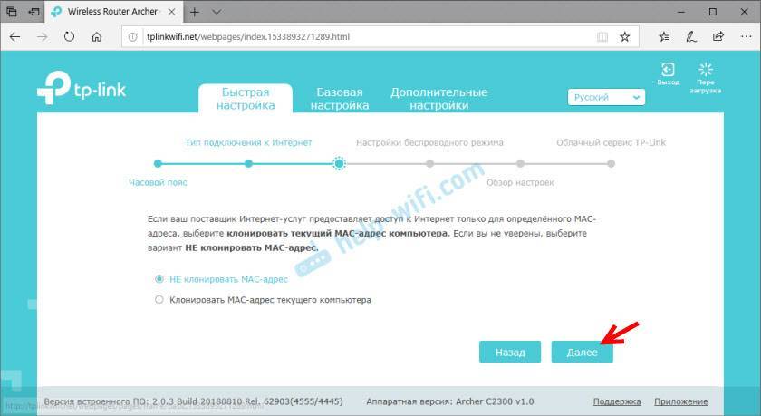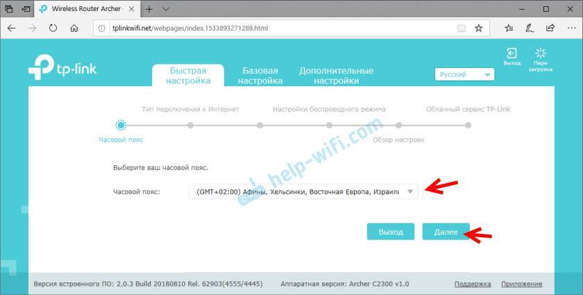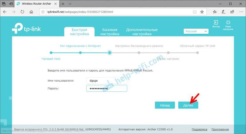 В этом роутере есть много предустановленных настроек интернет. Для разных стран, городов, провайдеров. Выберите своего провайдера и тип подключения, который он использует и нажмите “Далее”.