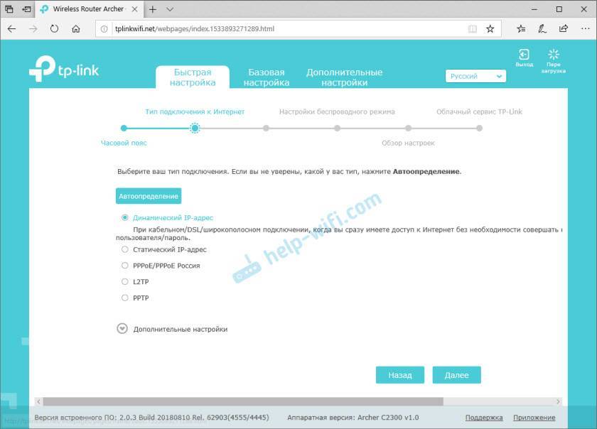 Дальше нужно выбрать тип подключения к интернету. Это очень важные настройки. Если вы не знаете какой тип подключения использует ваш интернет-провайдер – вам будет очень сложно настроить роутер. Нужно уточнить у провайдера эту информацию. Если “Динамический IP-адрес”, то просто оставляем галочку возле этого пункта и нажимаем “Далее”.
