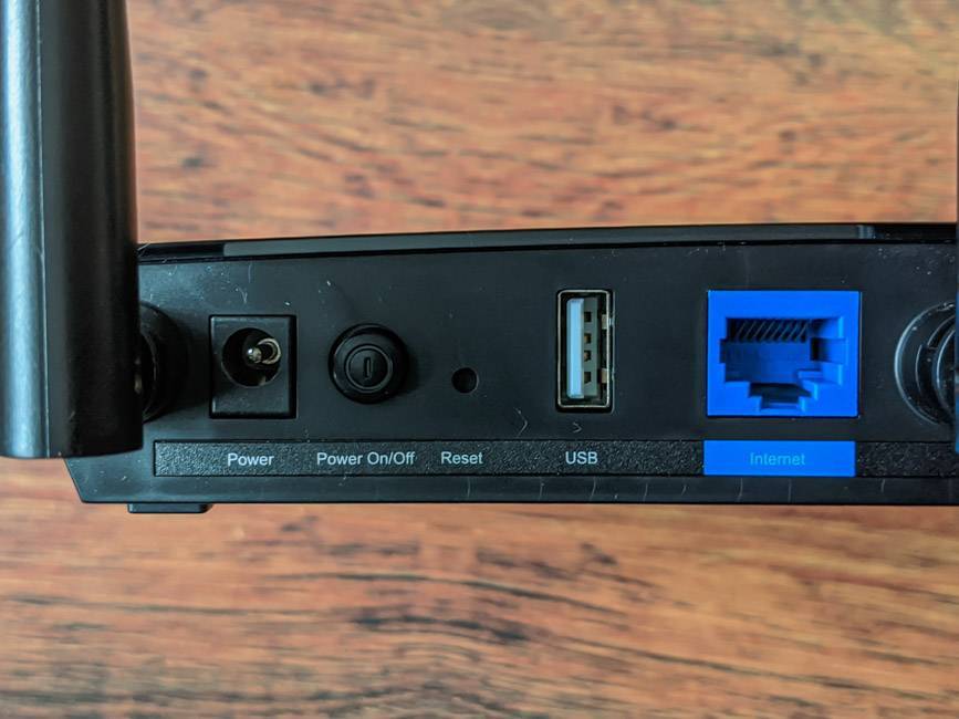 Здесь и три антенны, разъем питания, кнопка включения/выключения, отверстие с кнопкой сброса настроек к заводским, USB-порт, выделенный синим WAN, фантастическая четверка четыре LAN-порта и совмещенная кнопка WPS и включения/выключения Wi-Fi.