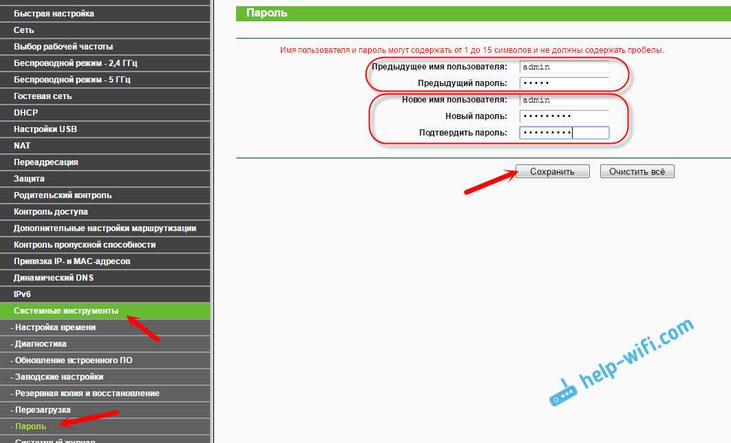 Настоятельно рекомендую сменить заводской пароль admin, который используется для защиты настроек маршрутизатора. Сделать это можно на вкладке ‘Системные инструменты’ – ‘Пароль’. Просто укажите старый пароль и имя пользователя, и новые данные. Сохраните настройки.